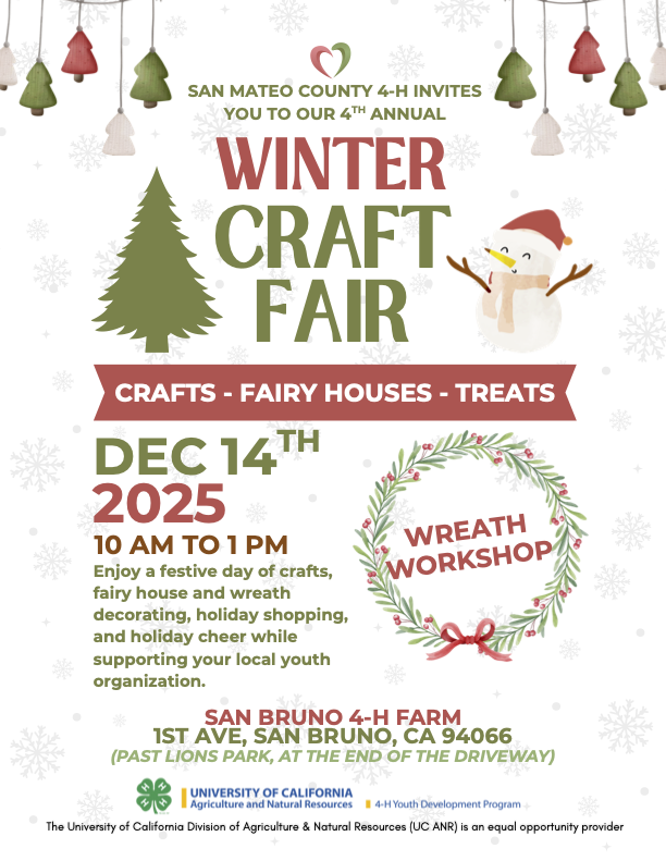 The San Bruno 4-H Club has a small farm and club house in San Bruno. The club offers hands-on projects and activities, directed by adult volunteers, for youth ages 5 to 19. Each youth member enrolls in the projects they are interested in, plus they attend monthly general meetings, fun days, farm clean-up days, and other organized club activities. A unique aspect of 4-H is that the club is run by the youth officers and members, so members learn leadership, good citizenship, and active participation in governance.