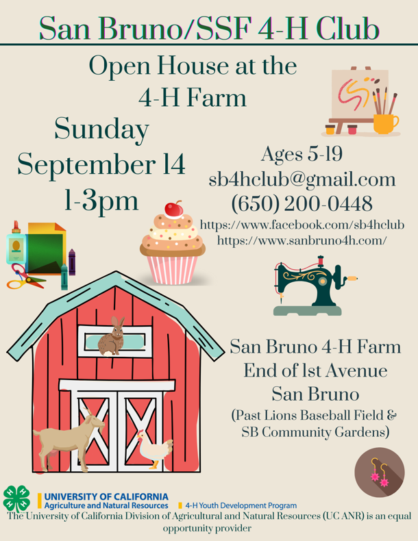 The San Bruno 4-H Club has a small farm and club house in San Bruno. The club offers hands-on projects and activities, directed by adult volunteers, for youth ages 5 to 19. Each youth member enrolls in the projects they are interested in, plus they attend monthly general meetings, fun days, farm clean-up days, and other organized club activities. A unique aspect of 4-H is that the club is run by the youth officers and members, so members learn leadership, good citizenship, and active participation in governance.