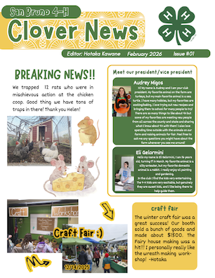 The San Bruno 4-H club is very active about participating in community events. We can be seen at Operation Clean Sweep in May, the Posy Parade in June, and Food and Clothing drives throughout the year. We also encourage all our members to exhibit project accomplishments in the San Mateo County Fair every June and many of our projects (be they animal exhibits, or clothing or artwork) can be seen on display in the large animal barn and 4-H exhibit hall.